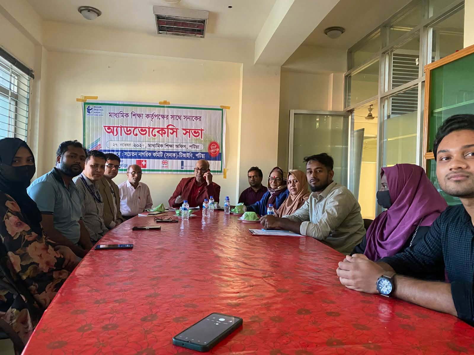 সুন্দর সমাজ গঠনে সুশিক্ষাই হোক প্রধান হাতিয়ার।এই প্রতিপাদ্য সামনে রেখে গত ২৭ নভেম্বর ২০২৫, সচেতন নাগরিক কমিটি (সনাক), পটিয়ার উদ্যোগে শিক্ষার মানোন্নয়নে উপজেলা মাধ্যমিক শিক্ষা কর্তৃপক্ষের সাথে অ্যাডভোকেসি সভা উপজেলা মাধ্যমিক শিক্ষা কর্মকর্তার কার্যালয়ে অনুষ্ঠিত হয়। এতে সভাপতিত্ব করেন পটিয়া উপজেলা মাধ্যমিক শিক্ষা কর্মকর্তা বাবুল চন্দ্র নাথ। এ সময় উপস্থিত ছিলেন উপজেলা একাডেমিক সুপারভাইজার বাবুল কান্তি নাথ, সনাক পটিয়ার সহ-সভাপতি ও শিক্ষা উপকমিটির আহবায়ক সাংবাদিক আবদুর রাজ্জাক, সনাক সহ-সভাপতি শীলা দাশ, সনাক সদস্য নিলুফার জাহান কুমু, সনাক সদস্য রূপস মুৎসুদ্দী, টিআইবির এরিয়া কোর্ডিনেটর এ. জি. এম. জাহাঙ্গীর আলম।